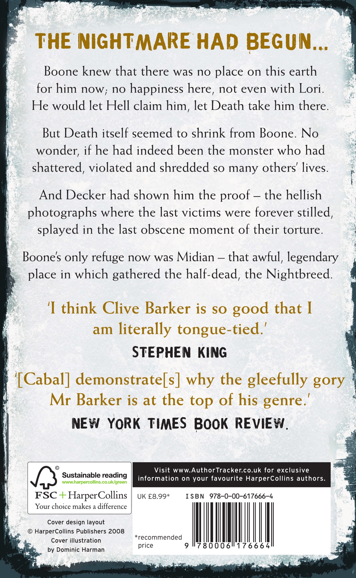 A fabulous journey through the mind of the master of dark imaginative fiction, Clive Barker. The nightmare had begun…. Boone knew that there was no place on this earth for him now; no happiness here, not even with Lori. He would let Hell claim him, let Death take him there. But Death itself seemed to shrink from Boone. No wonder, if he had indeed been the monster who had shattered, violated and shredded so many others’ lives. And Decker had shown him the proof – the hellish photographs where the last victims were forever stilled, splayed in the last obscene moment of their torture. Boone’s only refuge now was Midian – that awful, legendary place in which gathered the half-dead, the Nightbreed…