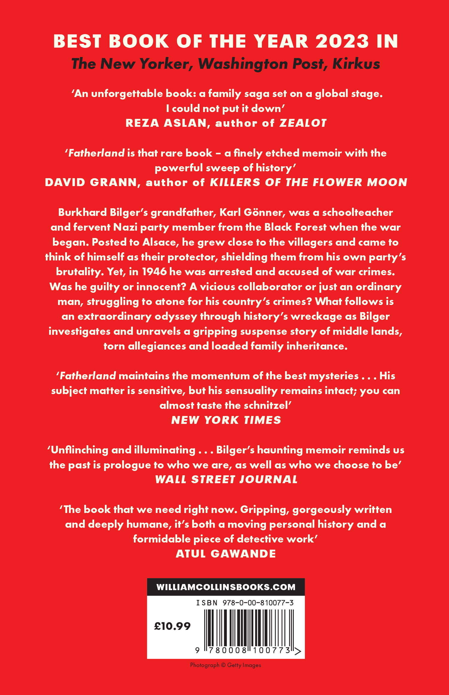 EARLY PRAISE FOR FATHERLAND ‘Fatherland is the book that we need right now. Gripping, gorgeously written, and deeply humane, it’s both a moving personal history and a formidable piece of detective work. Bilger wrestles with one of the essential questions of our time: How can we make peace with our ancestors’ past?’ Atul Gawande, author of Being Mortal ’Burkhard Bilger has long been one of our great storytellers: an acute observer, an intrepid reporter, and a writer of unmatched grace. Now he has brought these gifts to his own family story, rummaging through the past to unearth long-kept secrets and to shed light on the nature of war and complicity. Fatherland is that rare book—a finely etched memoir with the powerful sweep of history’ David Grann, author of Killers of the Flower Moon ‘An important and compelling investigation into one family’s dark and troubling history, grippingly told’ Thomas Harding, author of Hanns and Rudolf ‘Bilger’s atmospheric account probes the complex ethical ambiguities of wartime Alsace and his mother’s harrowing childhood experience of the defeat and devastation of Germany, conveying both narrative strands with a fine moral irony couched in prose that’s both psychologically shrewd and matter-of-fact’ Publishers Weekly, *starred review* ‘[A] powerful investigation of morality…a vivid portrait of [Bilger’s] grandfather and his times [and] a fascinating, deeply researched work of Holocaust-era history… A moving, humane biography’ Kirkus, *starred review*