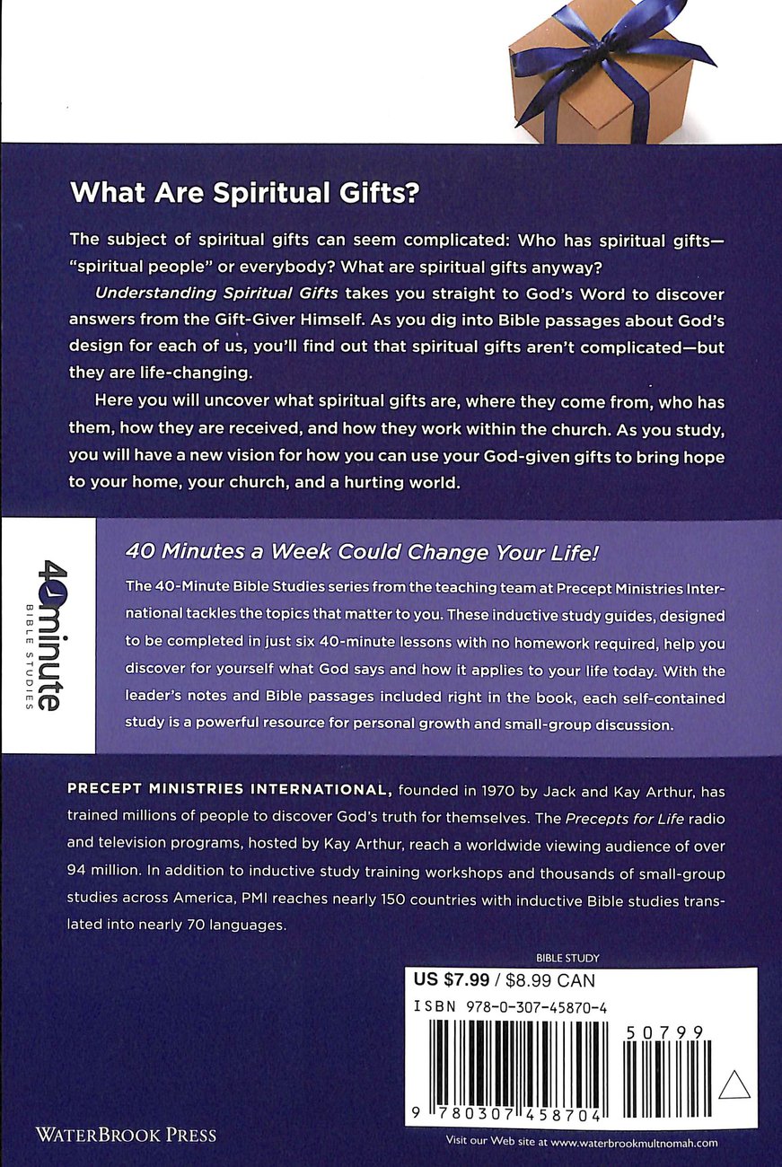 Readers of all ages will find fresh encouragement for putting their own unique spiritual gifts to work through the insights they gain in this six-week, no-homework study. What Are Spiritual Gifts? The subject of spiritual gifts can seem complicated- Who has spiritual gifts--""spiritual people" or everybody? What are spiritual gifts anyway? Understanding Spiritual Gifts takes you straight to God's Word to discover answers from the Gift-Giver Himself. As you dig into Bible passages about God's design for each of us, you'll find out that spiritual gifts aren't complicated--but they are life-changing. Here you will uncover what spiritual gifts are, where they come from, who has them, how they are received, and how they work within the church. As you study, you will have a new vision for how you can use your God-given gifts to bring hope to your home, your church, and a hurting world. 40 Minutes a Week Could Change Your Life! The 40-Minute Bible Studies series from the teaching team at Precept Ministries International tackles the topics that matter to you. These inductive study guides, designed to be completed in just six 40-minute lessons with no homework required, help you discover for yourself what God says and how it applies to your life today. With the leader's notes and Bible passages included right in the book, each self-contained study is a powerful resource for personal growth and small-group discussion.