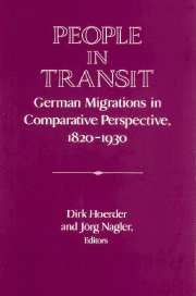 Part I. Continuity and Complexity: Migrations from East Elbian Germany and Galician Poland: 1. German emigration research, north, south, and east: findings, methods, and open questions Walter Kamphoefner; 2. Nineteenth-century continental and transoceanic emigrations: a history of East Elbian Prussia Rainer Mühle; 3. Overseas emigration from Mecklenburg-Strelitz: the geographic and social contexts Axel Lubinski; 4. Emigration from Regierungsbezirk Frankfurt/Oder, 1815–93 Uwe Reich; 5. Preserving or transforming role?: Migrants and Polish territories in the era of mass migrations Adam Walaszek; Part II. Internal German Migrations and In-Migrations: 6. Traveling workers and the German labor movement Horst Rössler; 7. Migration in Duisberg, 1821–1914 James H. Jackson Jr; 8. In-migration and emigration in an area of heavy industry: the example of Georgsmarienhütte, 1856–70 Susanne Meyer; 9. Foreign workers in and around Bremen, 1884–1918 Karl Marten Barfuss; Part III. Women's Migration: Labor and Marriage Markets: 10. The international marriage market: theoretical and historical perspectives Suzanne M. Sinke; 11. Making service serve themselves: immigrant women and domestic service in North America, 1850–1920 Joy K. Lintelman; 12. German domestic servants in America, 1850–1914: a new look at German immigrant women's experience Silke Wehner; 13. Acculturation of immigrant women in Chicago at the turn of the twentieth century Diedre Mageean; Part IV. Acculturation in and Return from the United States: 14. Communicating the old and the new: German immigrant women and their press in comparative perspective around 1900 Monika Blaschke; 15. Return migration to an urban center: the example of Bremen, 1850–1914 Karen Schniedewind; 16. Migration, ethnicity, and working class formation: Passaic, New Jersey, 1889–1926 Sven Beckert; 17. Changing gender roles and emigration: the example of German Jewish women after 1933 and their emigration to the United States, 1933–45 Sibylle Quack; Conclusion: migration past and present: the German experience Klaus J. Bade; Bibliographic essay; Research on the German migrations, 1820s to 1830s: a report on the state of German scholarship Dirk Hoerder.