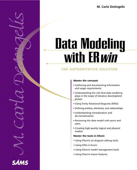 From the first chapter, author Carla DeAngelis skillfully explains the normally complex concepts of Data Modeling-a critical success factor in the information-based enterprises of today. Carla tackles complex topics such as Logical Data Models, Modeling Methodologies, Relationships, and Attributes in a clear style that makes it simple for anyone to begin applying them immediately. Once the foundation has been laid, Carla teaches you to develop your own databases with ERwin. You will learn to use the tool to create primary keys and assign attributes, build data relationships with point and click ease, build and edit tables with Erwins built-in editors, create indexes with the Index Editor, write custom SQL scripts, and process reports with the Report Tools.