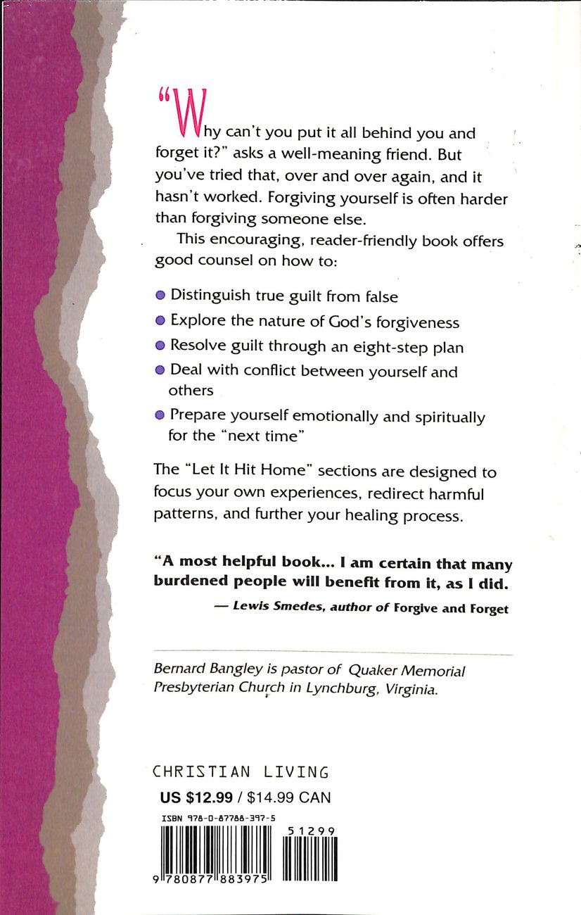 "Why can't you put it all behind you and forget it?" asks a well-meaning friend. But you've tried that, over and over again, and it hasn't worked. Forgiving yourself is often harder than forgiving someone else. This encouraging, reader-friendly book offers good counsel on how to- . Distinguish true guilt from false .Explore the nature of God's forgiveness .Resolve guilt through an eight-step plan .Deal with conflict between yourself and others .Prepare yourself emotionally and spiritually for the "next time" The "Let It Hit Home" sections are designed to focus your own experiences, redirect harmful patterns, and further your healing process. "A most helpful book . . . I am certain that many burdened people will benefit from it, as I did."-Lewis Smedes, author of Forgive and Forget