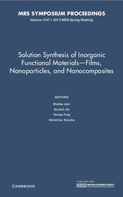 Home > Science, Technology & Agriculture > Mechanical engineering and materials > Materials science > Solution Synthesis of Inorganic Functional Materials - Films, Nanoparticles, and Nanocomposites: Volume 1547: (MRS Proceedings)