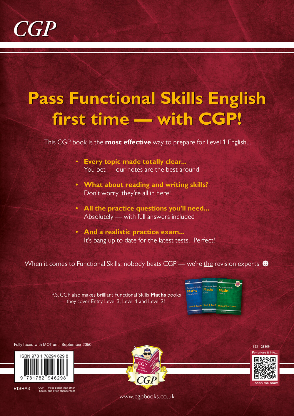 This essential Functional Skills English book has everything students need to succeed in the Level 1 English tests! It covers every exam board and every topic and skill from the latest L1 Functional Skills Reading and Writing specifications. Everything's explained in CGP's easy-to-understand style, with examples and notes galore. Each topic is followed by a page of practice questions, so you can learn then test yourself as you go. We've included exam-style practice papers for Reading and Writing with full answers — so you'll know what to expect on the big day. Smashing!