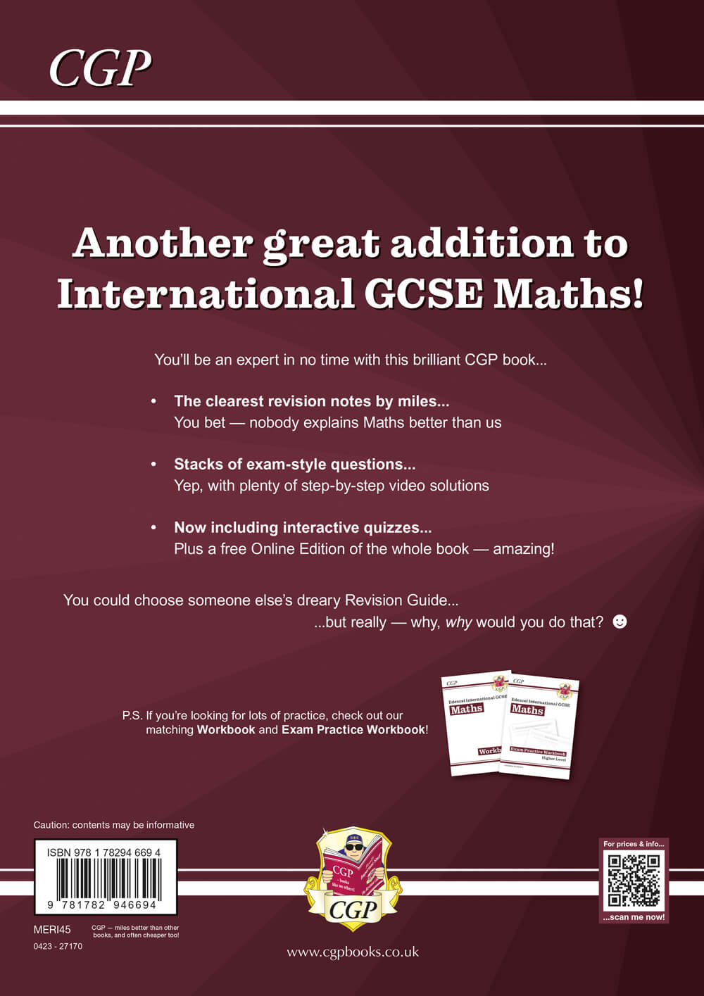 This brilliant Revision Guide covers everything you need for Edexcel's International GCSE Maths course (Specification A)! It's full of clear explanations of every topic, with helpful tips and worked examples - plus grade information to show which topics are the most (and least) difficult. You'll also find exam-style questions for realistic practice. Short answers to all the questions are included in the back of the book and full step-by-step answers can be accessed through the free Online Edition that's included! We've also thrown in online quizzes and video solutions for extra help that can be accessed from QR codes throughout the book. For even more practice, don't miss the matching Exam Practice Workbook (9781782946700) and Revision Cards (9781789084061).